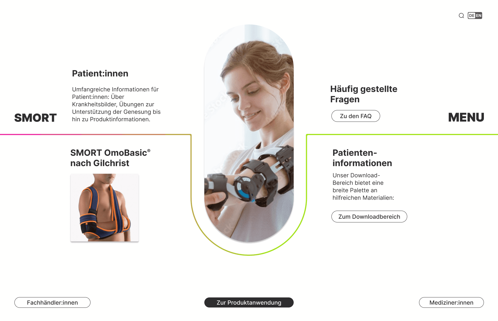 Für den SMORT-Pitch habe ich ein alternatives Leitsystem für die Website des Herstellers von Verbänden und Orthesen entworfen. Die Basislinie in drei Farben führt den Benutzer durch die Benutzeroberfläche. Sie stellt den Heilungszyklus dar, in dem SMORT-Produkte immer wieder erscheinen und die Heilung der Patienten unterstützen.
