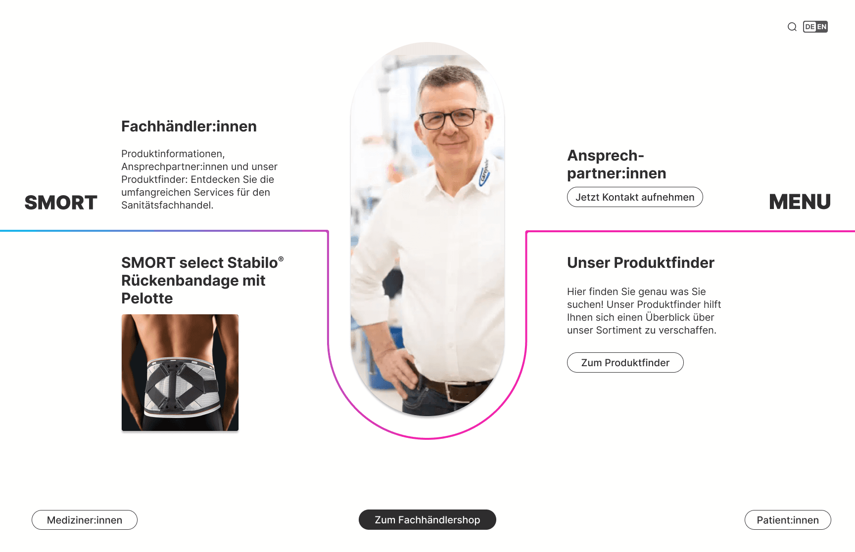 Der digitale Heilungskreislauf für SMORT: Für den Pitch um den Web-Relaunch des Traditionsunternehmens SMORT habe ich ein Konzept entwickelt, das die klassische Website-Struktur aufbricht. SMORT ist Hersteller von Orthesen und Verbänden – Produkte, die Menschen in verschiedenen Phasen der Genesung begleiten. Die Kernidee des Entwurfs ist der „Heilungskreislauf“. Eine dreifarbige Verlaufslinie fungiert als visueller roter Faden durch die gesamte Benutzeroberfläche. Sie symbolisiert die Flexibilität der Produkte sowie den fließenden Übergang zwischen den Anwendungsgebieten. Das visuelle Konzept setzt auf einen starken Kontrast: Ein seriöses Schwarz und Weiß bilden die solide Basis und spiegeln das Vertrauen in die Traditionsmarke wider. Der bunte Verlauf bricht diese Strenge auf, setzt frische Akzente und verknüpft die drei Hauptzielgruppen (Händler, Mediziner und Patienten) in einem intuitiven Erlebnis.